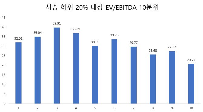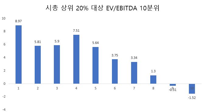 낮을수록 초과수익률을 낼 확률이 높다고 알려져 있는 EV/EBITDA 값을 전체 주식 대상으로 10 분위 백테스트한 결과는 위 와 같다. 2 분위부터 선형구조로 정확히 우하향한 모습을 볼 수 있다. 테스트를 하기 전에는 이 팩터에 대한 기대감이 많지 않았으나 위 그래프를 보니 앞으로 소형주와 대형주의 결과가 기대가 된다.