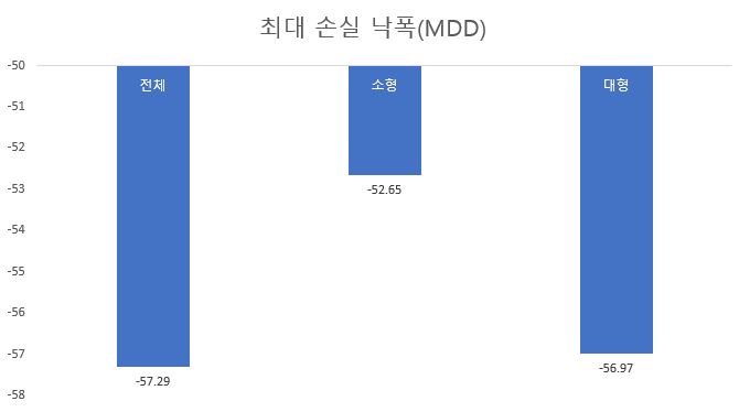 최대 손실 낙폭 또한 소형주가 가장 낮았으나 대형주가 이번에는 선방한 모습을 보였다. 전체 주식보다 0.32% p 앞선 수치이다. 하지만 수익률에서 차이가 많이 나기 때문에 유의미한 수치는 아닌 것으로 보인다.