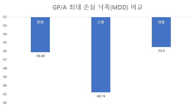 지금까지 분석한 모든 팩터들은 소형주의 MDD가 가장 낮았고 대형주의 MDD가 가장 높았다. 하지만 GP/A 값은 완전 반대의 결과가 나와서 조금 놀라웠다. GP/A 값을 포함하여 소형주 투자 시 수익률이 높지만 MDD가 높다는 것을 감안해야 한다는 이야기가 된다.