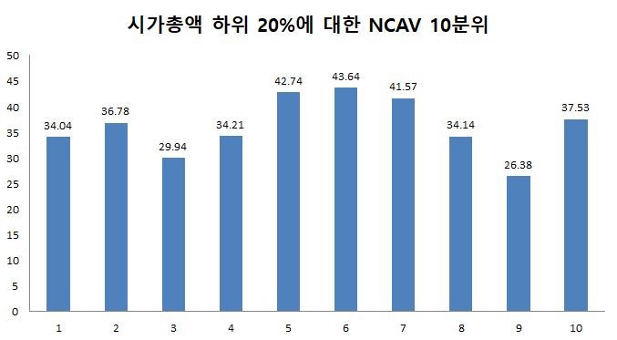 대형주에서는 완전히 반대의 결과가 나왔다. NCAV가 높은 기업이 오히려 수익률이 많이 떨어지는 모습이고 10 분위로 갈수록 수익률이 높아지는 모습이다. 이 정도면 테스트를 잘못한 것이 아닌가 하여 필터와 시총을 몇 번이나 확인했으나 잘못된 부분은 찾지 못했다.