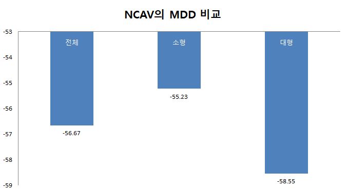 그래프가 큰 관계로 꽤나 큰 차이 같지만 MDD가 가장 낮은 소형주와 MDD가 가장 높은 대형주와의 차이는 3.32% p 뿐이다. MDD는 큰 차이는 없어 보인다.