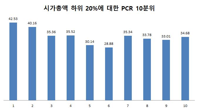 6 분위까지 선형구조를 보이다 다시 수익률이 상승하며 V자를 그린 모습이다. 다른 팩터들과 같이 PCR이 낮을수록 수익률이 높아진다는 것이 확인이 되었고 PCR 팩터 또한 꽤나 유의미한 팩터인 것으로 판단된다. 전체 주식을 대상으로 수익률을 확인해보았으니 소형주와 대형주에서 얼마나 유의미한지도 살펴보도록 하자.