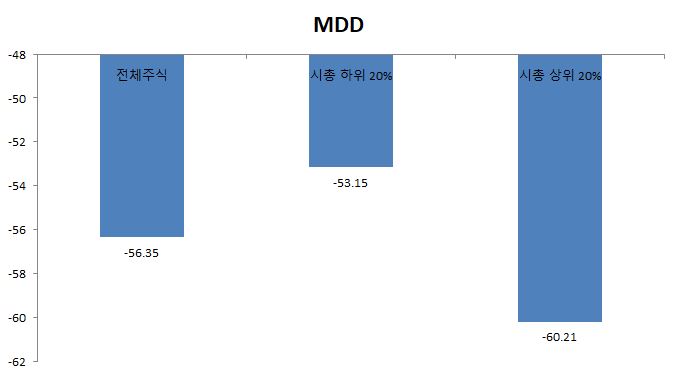 결과는 예상했던 대로 소형주에서 가장 좋은 수익률이 나왔다. 수익률 또한 다른 팩터들에 비해 꽤나 준수해 보인다. 투자를 했다는 가정이기 때문에 MDD 또한 궁금하지 않을 수가 없다.