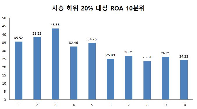 대형주는 다소 들쭉날쭉한 것이 썩 보기에 좋은 패턴은 아닌 것 같아보며 수익률도 굉장히 저조하다는 모습을 볼 수 있다. 대형주와 ROA는 굳이 조합해야 할 필요성을 못 느끼겠다.